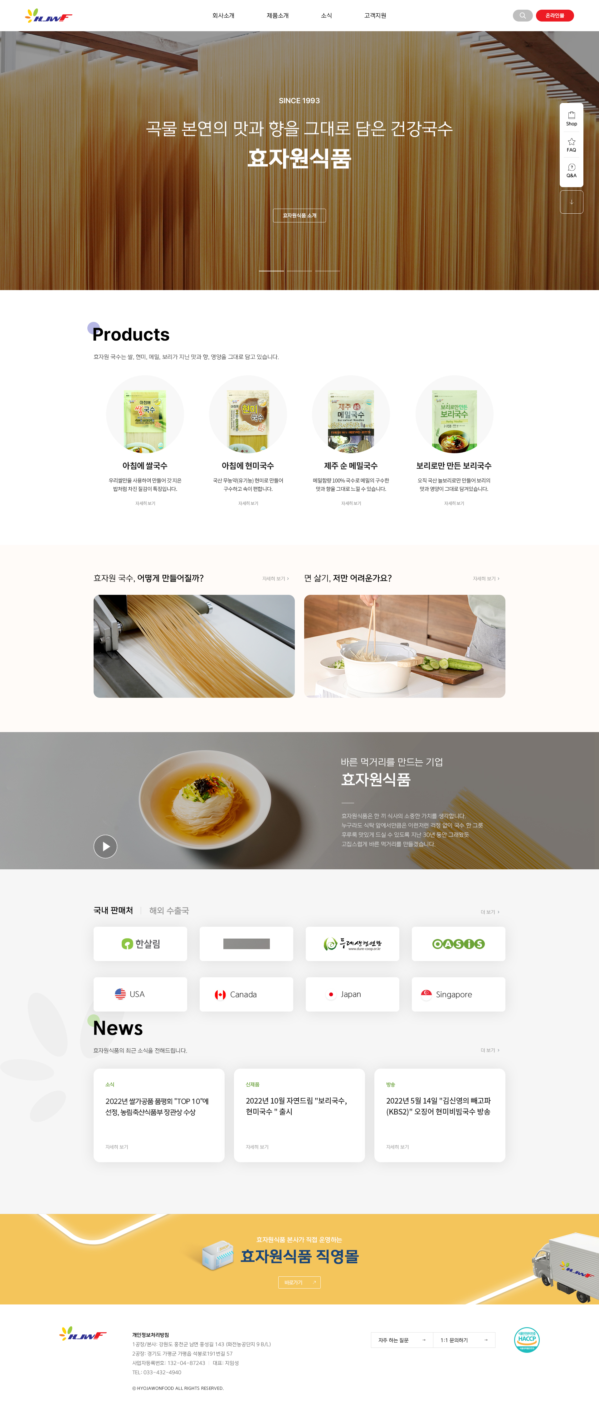 효자원식품의 공식 웹사이트를 리뉴얼했습니다. 특허 기술로 곡물 본연의 맛을 담은 국수 제품(쌀·현미·메밀·보리 등)의 신뢰도를 강화하기 위해 깔끔한 제품 카테고리 구성과 직관적인 내비게이션을 적용했습니다. ‘회사소개’, ‘제품소개’, ‘판매처’ 등 핵심 정보 접근성을 높이고, 기업의 건강·안전 이미지에 맞춰 세련되면서도 정돈된 디자인을 구현했습니다. 또한, 본사 확장 및 수상 연혁 등의 브랜드 스토리를 강조해 신뢰감을 높혔습니다.