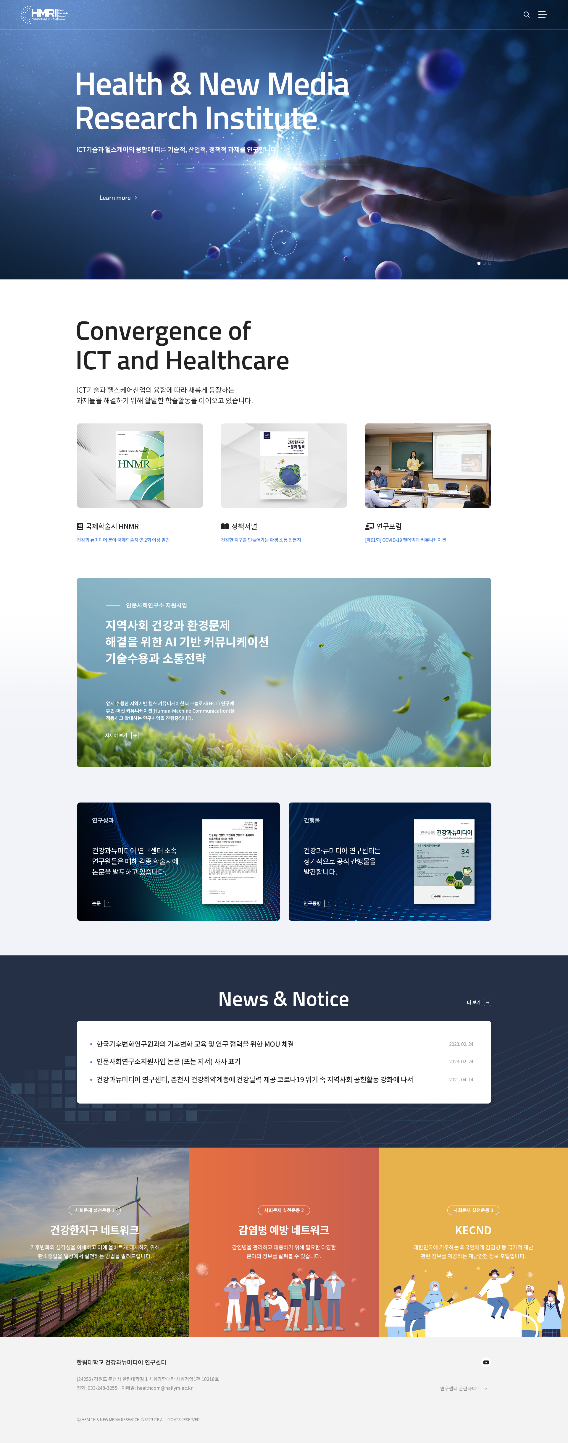 한림대학교 건강과뉴미디어 연구센터의 공식 홈페이지를 제작했습니다. 연구센터의 전문성과 학술 활동을 명확히 전달하기 위해 심플하면서도 구조적인 레이아웃을 적용했으며, 학술지·정책저널·포럼 등 핵심 콘텐츠를 한눈에 접근할 수 있도록 메뉴를 구성했습니다. 또한 모바일 대응성을 강화해 다양한 디바이스 환경에서 안정적으로 이용할 수 있도록 구현했습니다. 전체적으로 가독성과 정보 전달력을 높여 연구 중심 기관의 신뢰감을 전달하는 데 초점을 맞췄습니다.