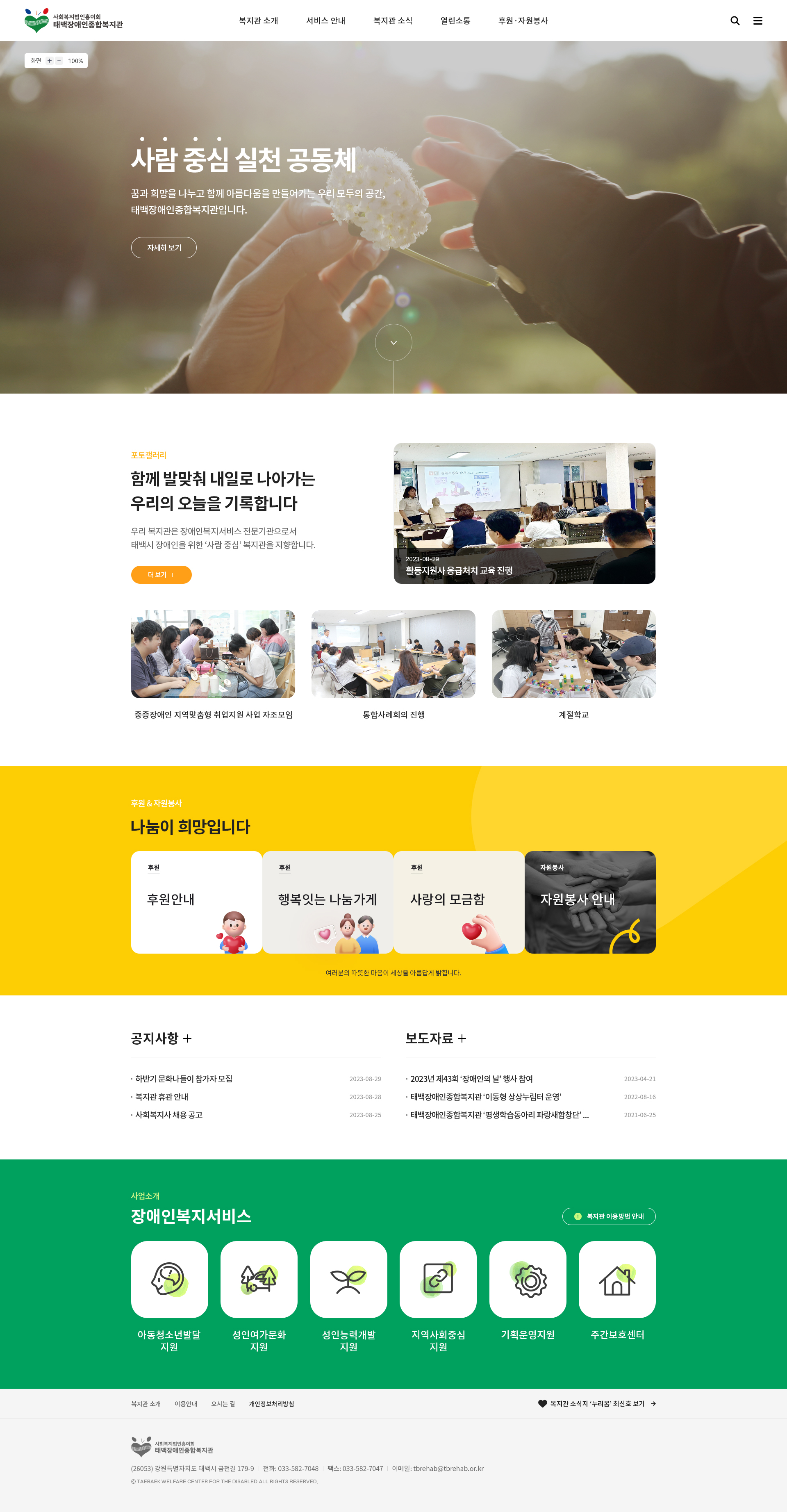 태백장애인종합복지관은 2023년 홈페이지 전면 개편에 이어, 2024년에는 부분 개편을 의뢰해 주셨습니다. 부분 개편은 기존 홈페이지의 구조와 스타일을 유지한 채, 일부 콘텐츠의 내용과 디자인을 보완하고 신규 서브 페이지를 추가하는 등 현 시점에 맞춘 업데이트 작업입니다. 이번 개편에서는 사용자가 원하는 페이지로 더 쉽게 이동할 수 있도록 전체 메뉴 구조를 조정하고, 메인 페이지와 일부 서브 페이지의 디자인을 개선했으며, 신규 서브 페이지도 추가했습니다.
