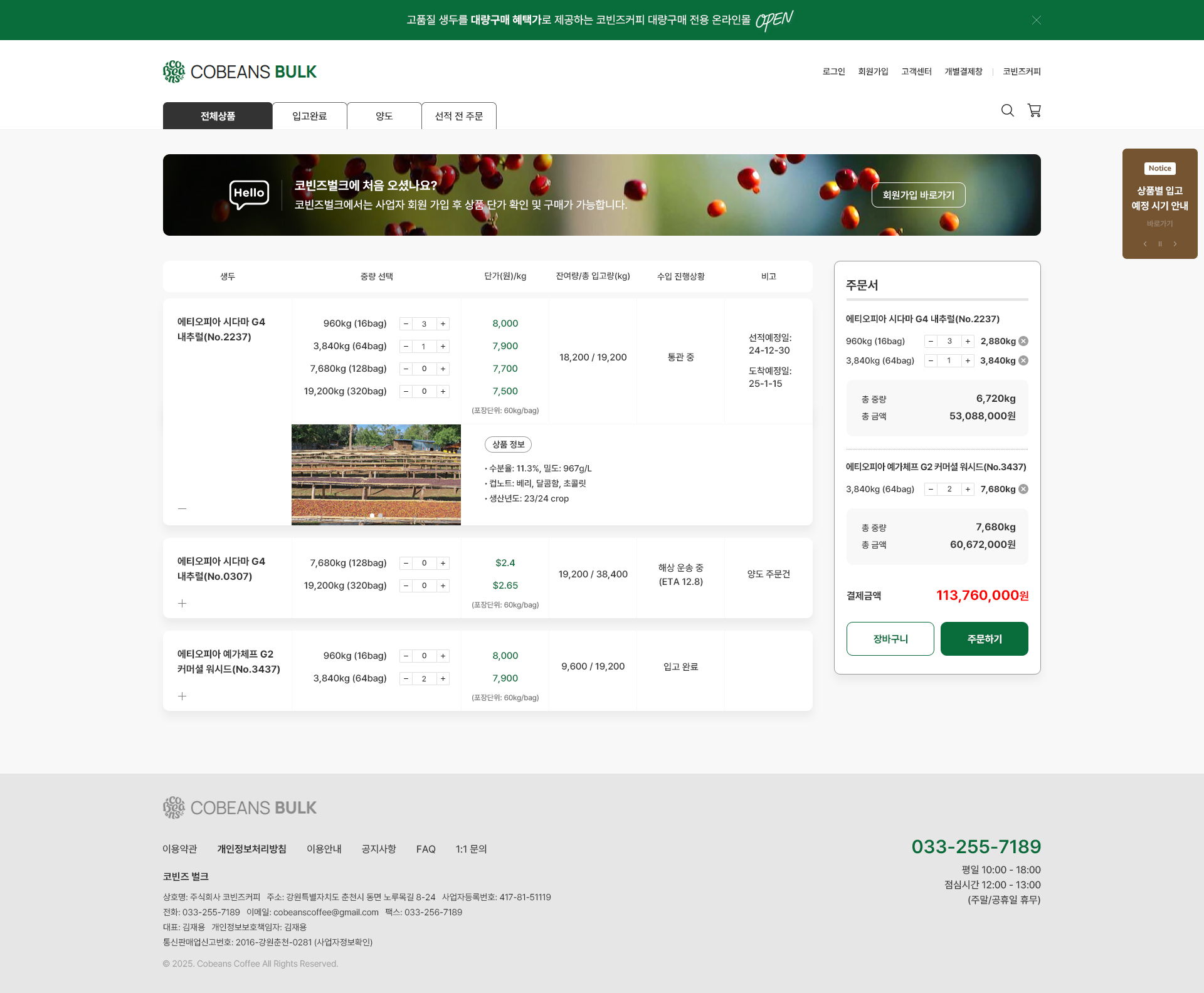 고품질 커피생두 온라인몰 코빈즈커피는 대량 구매를 주로 하는 사업자 회원을 위해 별도 사이트 제작을 의뢰했습니다. ‘코빈즈벌크’는 중량 960kg부터 주문 가능하며, 사업자 회원 로그인 후 각 상품의 단가를 확인할 수 있습니다.